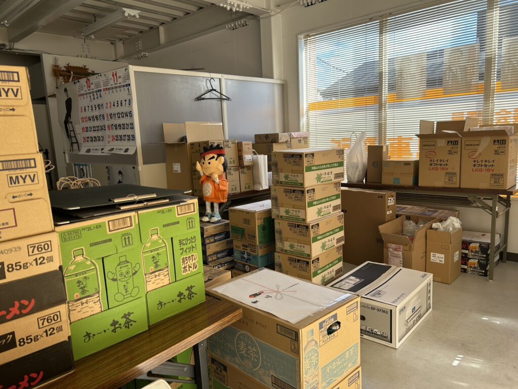 今日は朝から田崎市場を回り、新鮮な青果物などを集めましたが、事務所は賞品であふれんばかりの状態です。