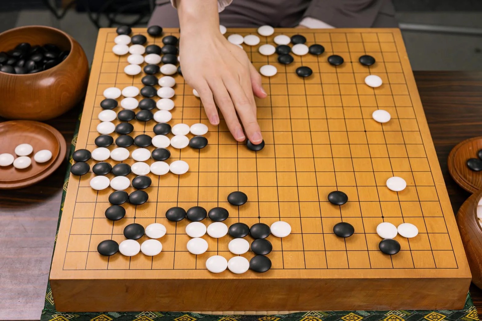 チェスは限られた駒を一気にぶつけ、短期で勝敗を決めるゲーム。一方、囲碁は広い盤面をじっくりと囲い、時間をかけて優勢を築く戦い方です。