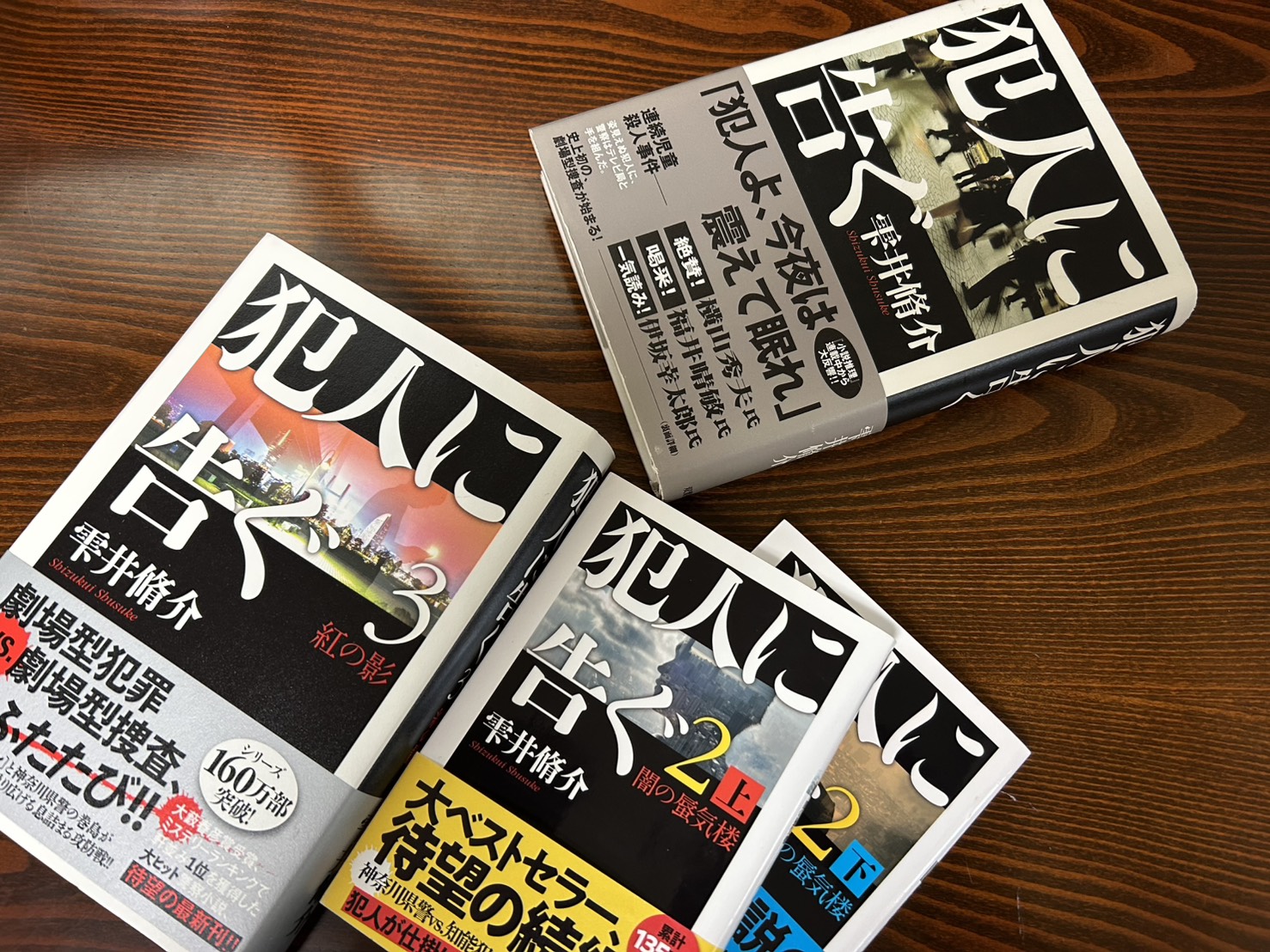 至福の時 熊本市 2025.12.30 こちらはこれまでに読了した 『犯人に告ぐ 」シリーズ①〜③です。 著者の 雫井脩介 さんらしい緻密な構成で、神奈川県警の巻島と犯人がメディアを介して繰り広げる心理戦は、従来の警察小説とは一線を画す斬新さがあります。 先日TSUTAYAで最新作となるシリーズ④を見かけ、読む前に改めて3作品を年末年始に読み返そうと思いました。 例年、近現代史の本を手に取ることが多いのですが、この年末年始は少し肩の力を抜き、物語の世界に浸ってリラックスしたいと思います。